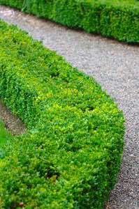 hedge de caixa, aparado, arbusto, caixa, caminho, cerca viva, dividir, folhas, formal, fronteira, grama, jardim, parque, pedras, planta, quadrado, verde