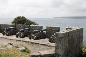 Canhões, Cornualha, Inglaterra, Inglês, ameias, antigo, arma, arquitetura, barril, canhões, confiança nacional, defender, defesa, defesa, estoque, foi, grã bretanha, histórico, metal, michael, monte, muralhas, ou, pedra, pistola, poder, proteger, rodas, santo, velho, vigor