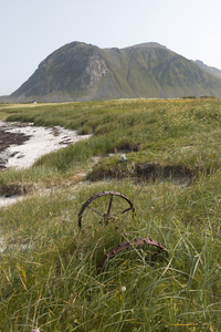 perdido da fazenda, Noruega, abandonado, costa, costeiro, desuso, enferrujado, enterrado, fazenda, ferramenta, gramíneas, implemento, litoral, metal, montanha, natureza, negligenciada, norueguês, perdido, praia, roda, selvagem, vegetação, velho