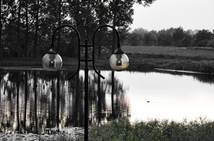 junto ao lago, céu, lago, lâmpada, lâmpada de rua, pato, reflexão, água, árvores