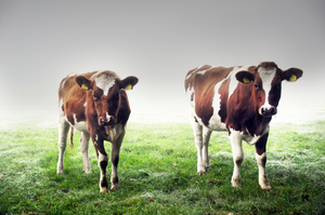 duas vacas, agricultor, agricultura, animal, campo, carne, cinza, dois, duo, enevoado, escuro, fazenda, frio, gado, grama, leite, mamífero, manhã, marrom, natural, natureza, névoa, outono, panturrilha, rural, vaca, vacas, verde